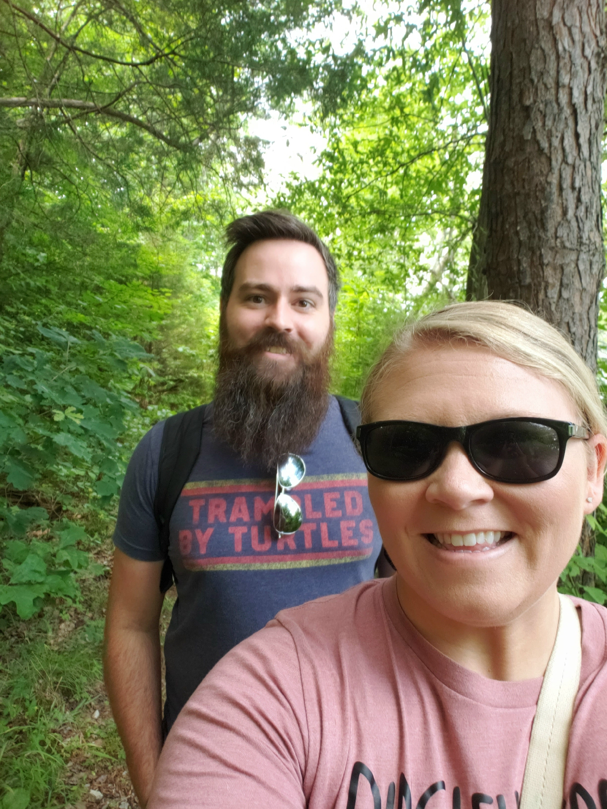 Our next stop in Shawnee National Forest was The Garden of the Gods. Obviously, the first thing I thought of when I heard the name was of Colorado. The area was beautiful with cliffs that you could see for miles from. This area was actually pretty busy with other people! We got one of the last parking spots in the area. I was surprised that it was as busy as it was, because the day we were there was the 4th of July! I figured everyone would have family things to do, but maybe since a lot of parades and other celebrations were canceled, they decided to go to an outdoor, open air area instead. We tried to stay away from people as best we could. We also had our masks on through most of our hike because they paths were narrow and since it was so busy and a fairly short path, we couldn't stay as far away from people as we would have liked. We even got crazy and, when someone asked if they could take our picture for us, handed the phone over and let them. Michael really enjoyed this stop on our trip. He said that through much of our hikes all you saw to the left and right were more trees. He really wanted to get up high enough to see over the trees and into the valleys. We were able to do that here. :-) The sign at the front said the loop was a quarter mile, but when there was a fork in the path, we, inevitably, took the longer route again. I can't remember exactly how long it was, but I believe it was somewhere between 3/4 of a mile and 1 mile that we ended up hiking at this stop. Not too terribly long, but by this point, I was completely done, tired, and over the hiking thing. So we left and started making our way the rest of the way through our drive to St. Louis. (I have already added a lot of pictures to this post, so I'm going to add the Garden of the Gods pics to the next post.)